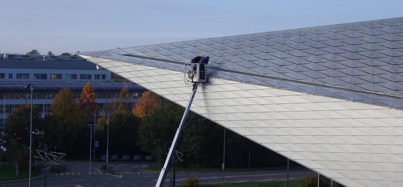 Une première visite a été réalisée sous des conditions météorologiques pluvieuses, permettant d’observer des infiltrations d’eau à différents points de la toiture et des façades. Une seconde inspection a eu lieu 6 jours plus tard, par temps sec, avec l’utilisation d’un camion nacelle pour examiner de plus près les défauts relevés.